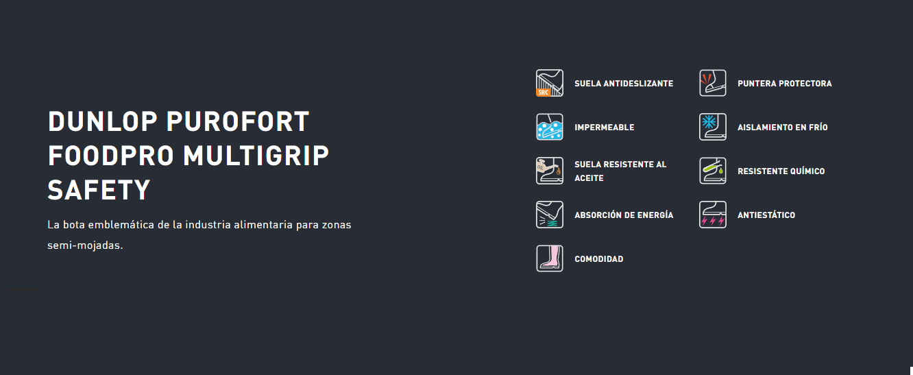 La DUNLOP FOODPRO PUROFORT MULTIGRIP FULL SAFETY es la bota de seguridad ideal para la industria alimentaria, ofreciendo una excelente protección contra el frío de hasta -20 °C (-4 °F).